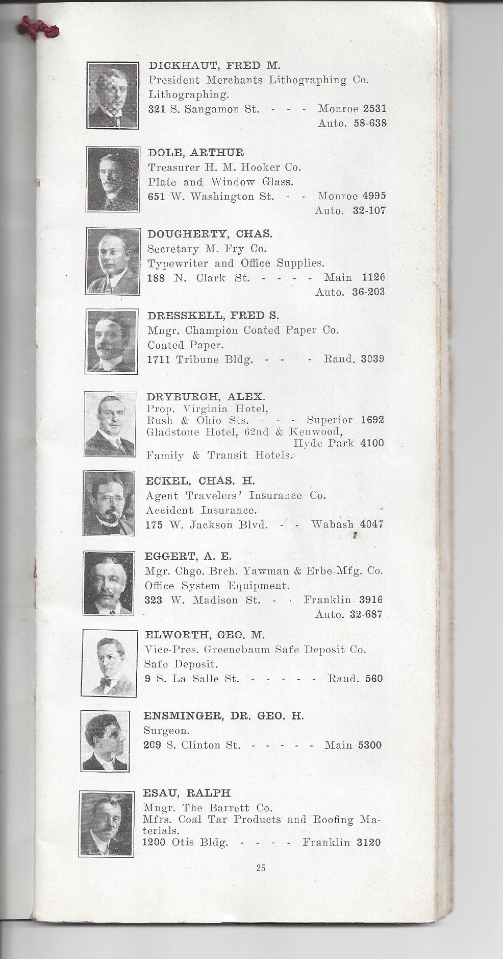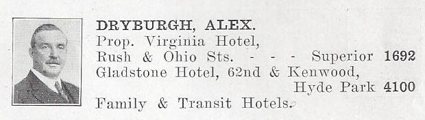 Alexander was still on the Rotary Club roster and remained so for several years. However, by 1913, he had also leased two further hotels, the Virginia and the Gladstone and later that year, he took over another hotel, the Vendome. The HOTEL MONTHLY suggests that the Vendome was remodeled to become the Gladstone Hotel. Dryburgh remained a Chicago member until at least 1916. Below is the entry from the Chicago Club roster.