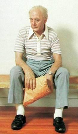 One foot hugged the curb, one foot in a used Nike tennis shoe, while the other Nike seemed restless in the grass. One foot was anchored to the man-made security of concrete where the other danced over the grass as if nature was a hunter-beast. The sand-fed grass beside the highway was sparse and gray-green. He wore a battle garment, an insulated pull-on suit which seemed to withstand this and future cold with zippered leggings half zipped. Of course the light changed and my normal day continued. But the leathery face was now etched into my artistic mind. Images are more powerful than stories. Images live in a sort of vertical space which jumps into our consciousness at any time. Stories must live in some man-created linear time which allows us the liberty to say, "That is past. I live in the present. And the future will take care of itself." With stories, some images can be erased from our minds. With an etched image which does not rely on time, this kind of image is called up at any time.