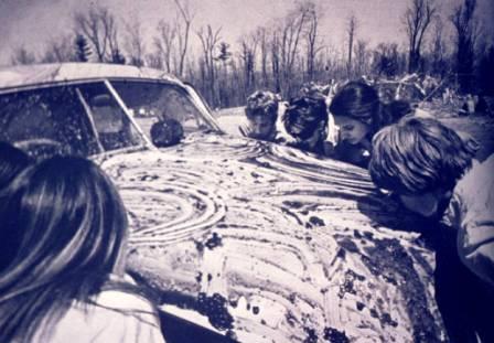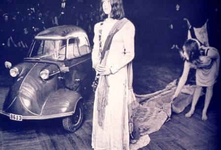 The first image that lingers in the corner of my mind concerning cars in art is the photograph of Rose-Marie Larsson standing beside a small foreign automobile in her wedding dress with train of 180-foot history-of-the-world-in-rags. The bug-like automobile and Rose-Marie were married in the fun-filled solemnity of a happening at the Modern Museum in Stockholm on April 7, 1964. The photograph was reproduced in Allan Kaprow’s Assemblage, Environments, & Happenings.