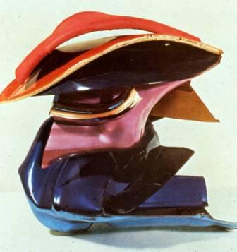 Earlier and later, John Chamberlain takes parts and other metal from the junkyard and uses these pieces of the car as material for constructionist creations. He resurrects the car into a new, “found-object”, a work of art out of the graveyard of contemporary life. The artwork is made up of the car parts but exists as a statement about something more than the car itself. Chamberlain continues the tradition of Cubism and Hans Hoffmann's breakup of color by giving the assembled car parts new life and new dimensions.