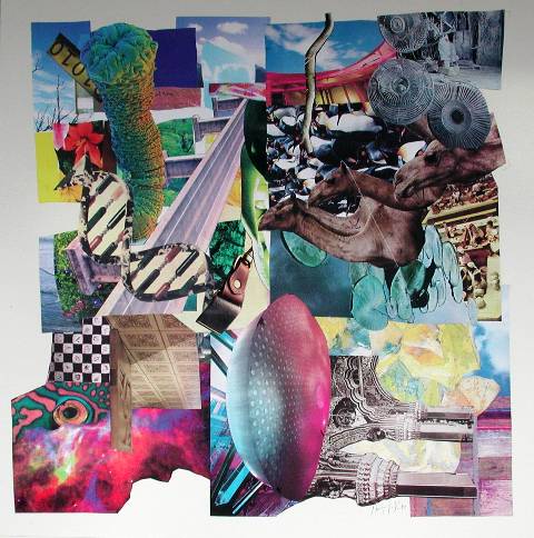 After working all January and February on new ideas and images that started as collages in the late months of 2004, I took three of my art pieces, some sticks that I had modeled and prepared as elements in the works (photographing the sticks, duplicating them at my outside studio — Kinko's — and then assembling them against the parallax view of color patchwork seen from the sky).