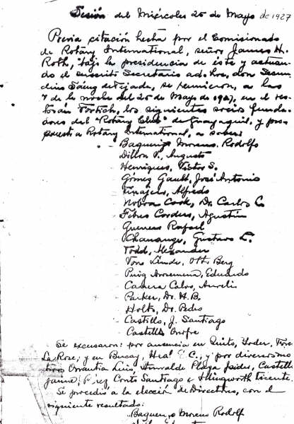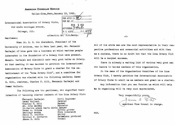More than a year went by, and finally on January 13, 1921, Mr. Roth sent a letter to the International Association requesting the admission of the Rotary Club of Lima. There were ten charter members, including James H. Roth and a man who later became R.I. President: Fernando Carbajal.