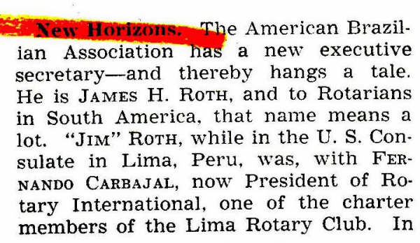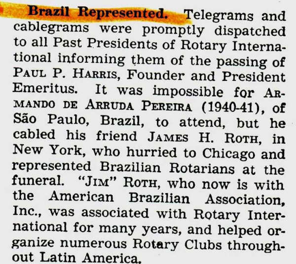 At Paul Harris death, Armando de Arruda Pereira, past President of R.I. who resided in Brazil, was unable to attend the funeral. He asked Don Jim to represent him and the entire country.