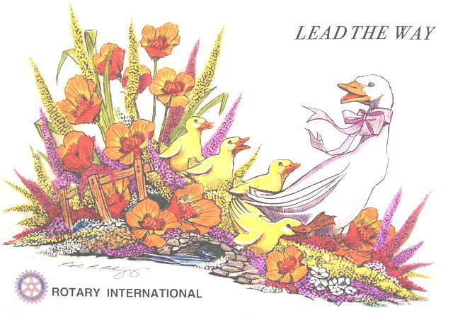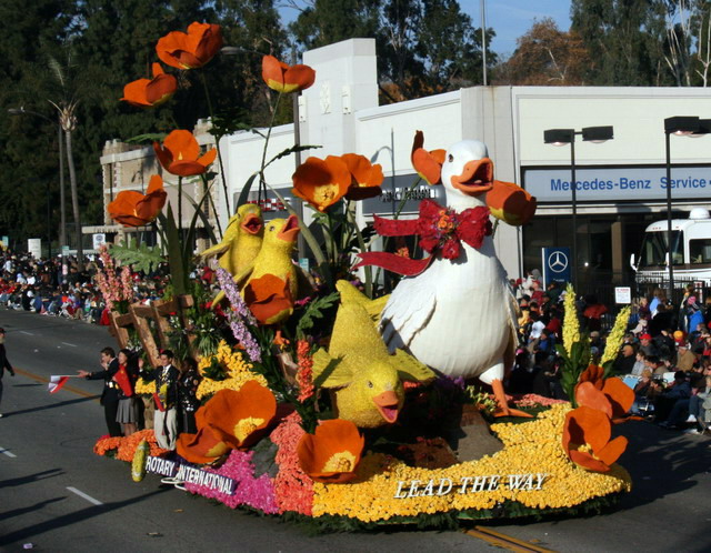 The theme was "Lead the Way" and the float presented a 16 foot mother duck leading her four young ducklings through a garden.  Thousands of roses, carnations, iris, gerbera daises and gladiolas were used on the float.  Riders on the float were selected from Rotary Exchange Students visiting the United States.