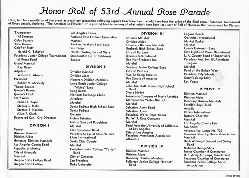 The theme of the Tournament of  Roses was "The Americas" and the Rotary float was in Division V.  Because of the outbreak of World War II, the parade was not held that year.  The picture is a list of parade entries published by the Tournament of Roses in 1942.