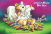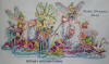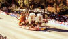 The theme was "The Magic of Caring".  The float presented a garden setting with mom and pop bear playing doctor and nurse to their baby bear.  Naturally colored cotton was used to create the fur on this loving family of bears.  Oversized flowers and toy tops, decorated with orange lentils, raspberry seed, split pea, statice and yellow strawflower, surrounded the bears in the garden.  A large arbor, whose criss-cross appearance was created using a pattern of corn husks, completes the garden setting