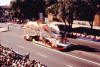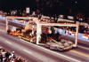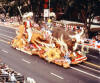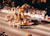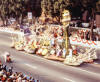 The rainbow colored float carried a revolving globe covered with white carnation petals, surrounded by a bouquet of Dutch Iris and silverleaf.  A musical staff with notes bordered the sides of the float, leading to the Rotary emblem, colored with swarms of pompoms and cornflowers.  The float's base was blanketed with 8,000 red roses.