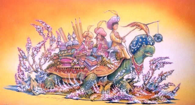 The 2002 float theme was "Around the World Through Education".  It was a magical journey that started on a 17-foot-tall turtle crafted from hundreds of pounds of split pea, lentil seeds, green tomatoes, strawflowers, statice and citrus fruit.  The decking of the float was vibrantly adorned using thousands of roses, carnations, lilies, iris and gerbera daisies with small and medium sculpted flowers creating the flowering branches on the deck.