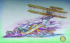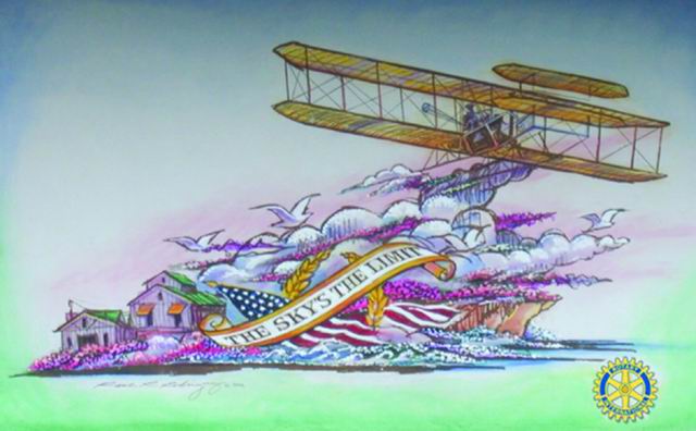 The theme of the float was "The Sky's the Limit".  In commemoration of the 100th anniversary of flight, the Rotary float depicted the sandy beach where the Wright Brothers took their first flight.  At the rear of the float was a group of buildings that are similar to the working areas of the bothers.  Sesame seed was used to achieve the fabric covering of the wings of the plane.  The deck was plush with grasses, roses, iris, carnations, and gebera daises-used to achieve the look of the sand dunes and groupings of growth along the shoreline.  Orville Wright was a Rotarian in Dayton, Ohio.