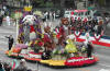The float titled "Caring for the World's Children" provided an opportunity to reveal the shining achievements of the PolioPlus campaign.  The float featured three medical officers on three different continents, each surrounded by children who have been immunized against polio and other childhood diseases.  Colorful flowers, animals, vegetation and monuments depicted the different cultures were immunization efforts have been carried out.