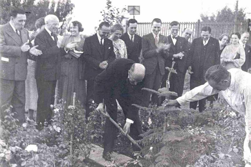 2 April 1936 as Paul Harris plants a tree in Montevideo along with Rotarians and local school children. Photo from the Paul Harris Study, at One Rotary Center in Evanston. |