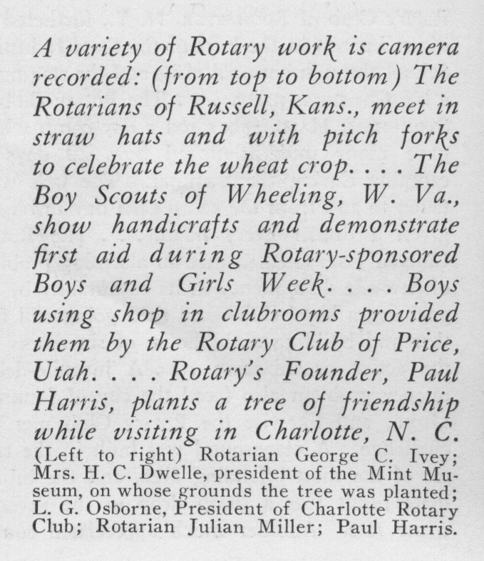 Harris planting a tree in Charlotte, North Carolina. (From the history of RC of Charlotte) Twenty-two RI presidents have visited the club including Paul Harris who in April, 1939, planted a tree from the soil of Illinois on the grounds of the Mint Museum of Art. (In 1959, a pruning from the English walnut - which is still very much alive - was made into three gavels: one for the Rotary Club of Chicago (the first club), one for the RI president and one for our club. |