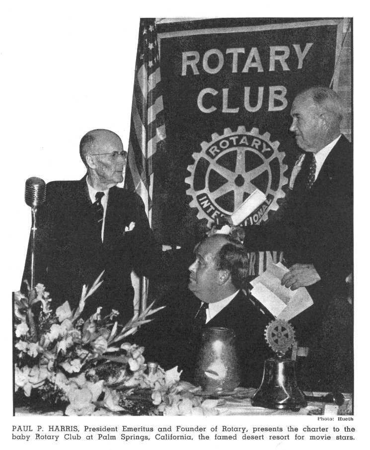 Prior to the planting in Long Beach, Harris presented the charter to Rotary Club of Palm Springs. Featured in the June issue of The Rotarian. |