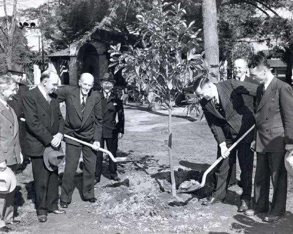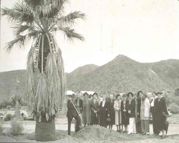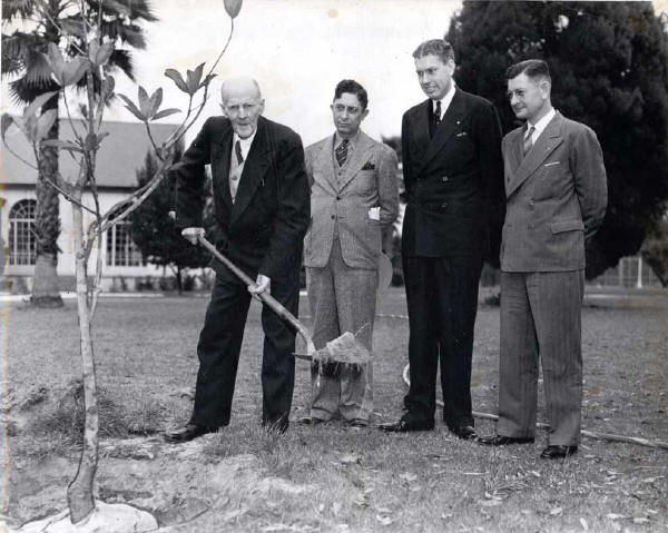 Paul Harris planting a tree in Cathedral City, California for the Women's Club of Cathedral City.