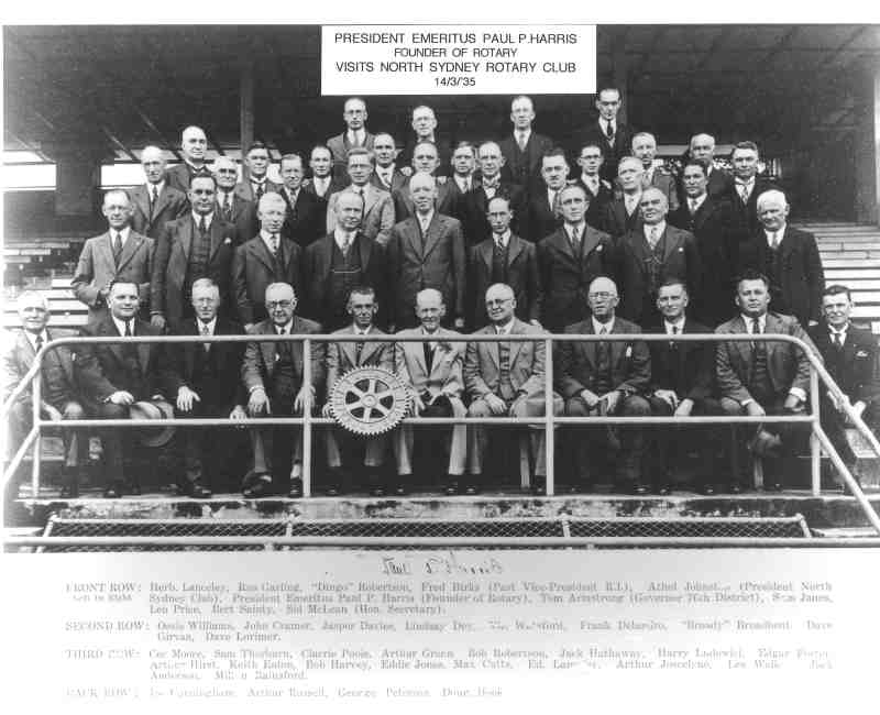 On 14 March 1935 the Club welcomed Paul Harris, the Founder of Rotary, to its meeting following which he planted a memorial tree (Queensland fire-wheel) in nearby St Leonards Park, after which a photograph recording the occasion was taken in the grandstand of North Sydney Oval next door.