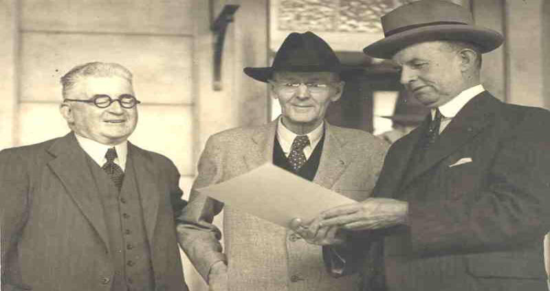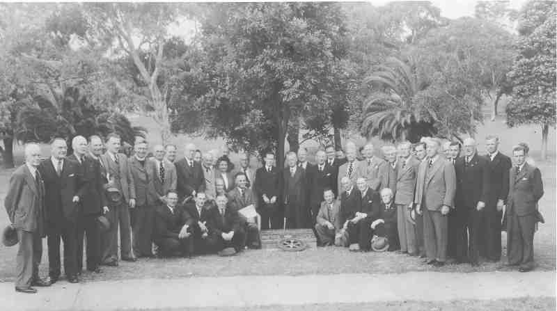 Paul Harris (far left) in 1935. Also seen are Sir Robert Garran (Charter President), DG Angus Mitchell (RI President 1948-49), DG Tom Armstrong, and Mrs. Jean Harris in the Australian National Rose Garden in Canberra. (The rest of the people are unidentified.)