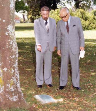 District 9920 Governor Edmund Lenthall and 1982-1983 RI President Hiroji Mukasa visiting a tree planted in Auckland, New Zealand by Paul Harris in 1935. Used in the February 1983 issue of The Rotarian. Use granted by Edmund Lenthall 13 February 2002