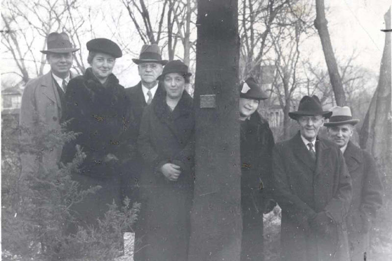 Paul and Jean Harris and others standing around a tree dedicated to the Rotary Club of Bendigo, Australia. Used in the February 1937 and June 1942 issue of The Rotarian.