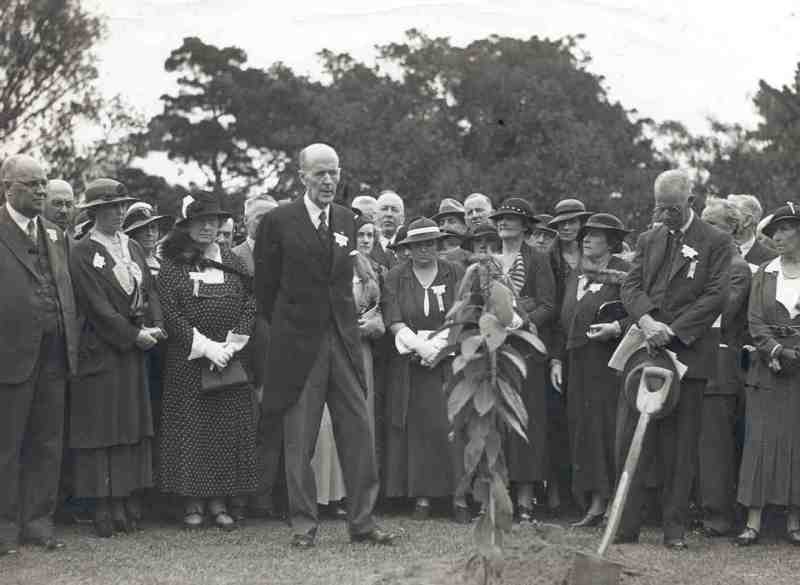 The tree was planted on 27 March 1935 in St. David's Park in Hobart. The Park is inner city, very pleasant with a lot of trees and lawns. The memorial plaque is still there.