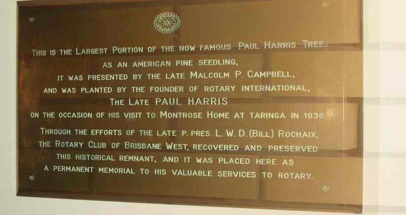 On his visit to Brisbane in 1935, Rotary's founder, Paul Harris, planted an American pine tree in the grounds of the Montrose Home for Crippled Children at Taringa. The home moved to Corinda in March 1938; and the Rotary Club of Brisbane West used the trunk of this tree for the making of Rotary ornaments (1970-71), and they placed the bole of the tree with a suitable message in the entrance of the new Montrose Home.