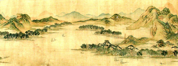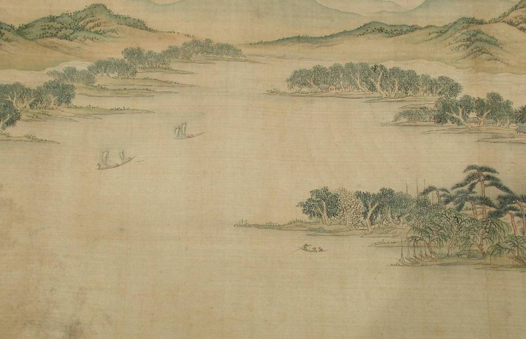 With the dark line of trees at the bottom containing our attention, the soft images of mountains in the distance at the top, a mist that rolls in and directs us to the past and the future (right and left), the suggestion of shelters are barely visible at the end of a bridge with someone just stepping upon it, and the rhythm of masts, sails and passengers on the boats are silhouetted against the expanse of the lake.