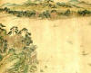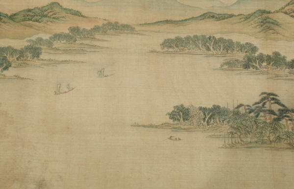 John Keats talks of the unknown as being “the darkening chamber of maiden thought” (putting the dark mists of the mind at work with virgin insights). He says that we enter something which is first light and then it slowly begins to darken while doors open to more dark chambers which in turn lighten and eventually, again, darken. This section of the hand scroll is my darkening chamber. I get lost in thought and meditation when the scene opens to the gray of mist and lake water. And no where do we find a place to rest, no where do we see a clear view of a shelter. For the moment, we are the ancient mariner when he says those classic lines, “Water, water everywhere, but not a drop to drink.” When there is so much to see and experience, at one point in time we turn the information coming into our system to the “Off” switch. After that, we float with the tide of the lake but do not drink from what is around us. Having a void in the center of two diagonal arms of trees that pulls us in like a black hole in this hand scroll is important to the process of cleaning out our minds so that new ideas and images can rush in. If the next experience is totally different in character than what we have been drifting with, then we need a mental and visual cleansing.
