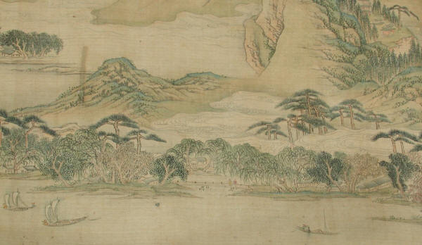 Where have we been? It is important that I point out that we started this trip from a sky view, not a land view. It was parallax vision, a view from above (like a satellite eye in the blue). We could put ourselves into the place of the companions on the boats, resting in the shelters and feeling loss as we had to move on toward something that we could not yet see or imagine. Robert Frost talks of this in his poem, The Road Not Taken. Anytime you begin a journey, like reading a poem that leaves holes for your imagination, it is the beginning of an ABA form: (A) “Shh, we are getting into something that we do not fully understand.” It is like when a mother asks her child where he or she is going. The answer comes back meekly, “Out.” (B) “We are confident in our skills and abilities with those around us,” we proclaim loudly to the world. The child who goes out now plays loudly with the other children, his or her equals, in the neighborhood. (A) “Shh, we have been out in the world and it is a scary place.” Our mother asks again when we return, “Where have you been?” and the answer is meekly, “No where.” “Who did you see out there and play with?” and again the answer comes back in a wee voice, “No one.” It is an ABA pattern in Frost’s poem and the sounds of the letters tell us about it. At the beginning, the poem has words with “s” in them, “shall” “this” “sign” “somewhere” “ages and ages” “hence” “roads”, then all at once short Anglo-Saxon words (sounds) appear to stop our listening, “wood” “I “ “I” “took” “one”, and finally back to s’s in the last two lines: “less” “has” “difference.” In this Ming Dynasty landscape hand scroll, we have visually been there and we understand the symmetry of the composition because our bodies and life history are made in the same form.