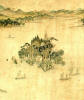 To our far left, some cliffs appear. All the boats are moored to the shore as we see seven masts. Above is an overhang of rock which should not be there and on it, giving us a continuity with what we saw in Part One, is a grouping of an ABA of trees, two green clumps around a cluster of pink blossoms and leaves.