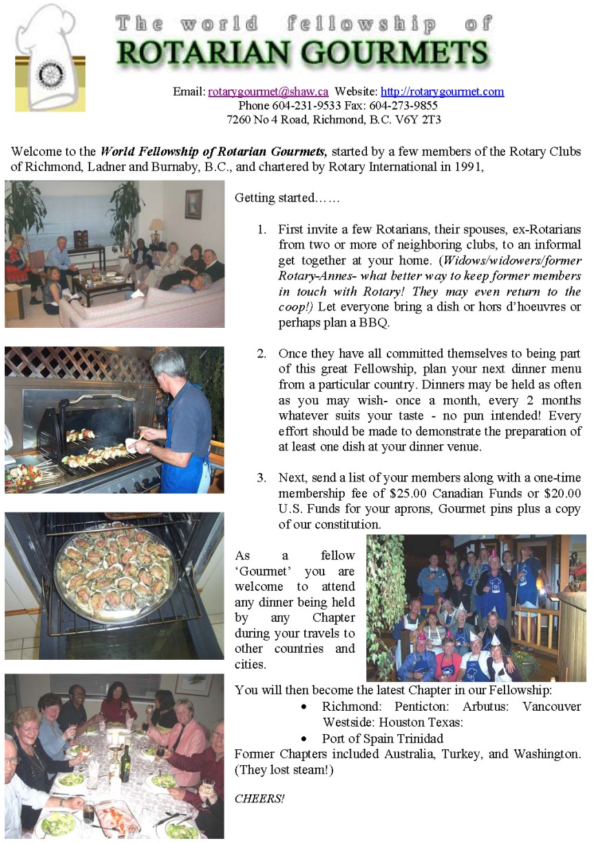 On January 14, 1990, four (4) members and their spouses from the neighboring Rotary Clubs of Ladner and Richmond, B.C. District 5040, met informally to discuss the merits of creating a Fellowship through Fine Dining and within the mandate of Rotary International’s rules for World Fellowship Activities. One of our main criteria for such an organisation was that the membership should not be comprised solely of the members of any one Rotary Club, but rather that in the true spirit of Rotary, it should consist of members from as many different neighboring Rotary Clubs within the District. Thus it was that one year later, on April 3, 1991, with the blessing of at least four (4) District Governors from four different Districts, as required by R.I., twenty two (22) members from seven neighboring Rotary Clubs in District 5040 received approval from Rotary International and Chapter 1- Richmond, B.C. was now up and cooking!