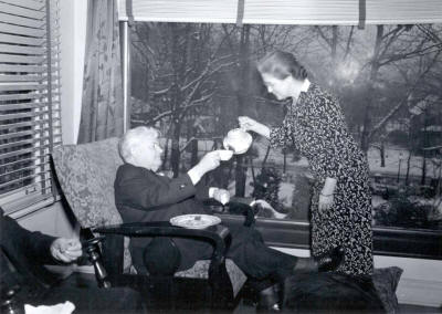 JEAN SERVING TEA IN THEIR SUNROOM "Queen of the fireside and the tea table at "Comely Bank" is my lady Jean and the thought often comes to me that her steadfast devotion to duty was not excelled even by grandmother. I am indeed a fortunate man; of that I am sure and this is the very place and this is the very hour for reverie even thought lady Jean maintains that my reveries far too frequently are preludes to cat naps and my cat naps preludes to slumber outright." Paul Harris |