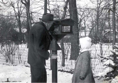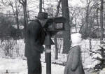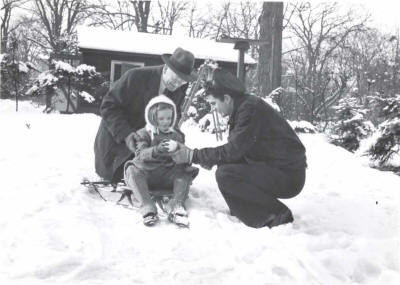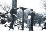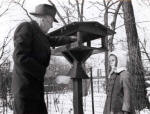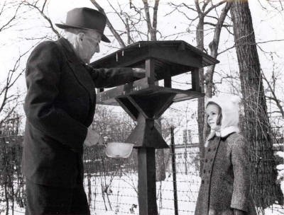 'SNOW TIME FOR CHILD'S PLAY | "'Comely Bank' where Paul and Jean lived for 35 years in suburban Chicago. On the right Paul cares for his bird friends while neighbor (Rotary's first president) Silvester Schiele looks on." Photo and text from "My Road to Rotary" by Paul P. Harris, 1947 | FEEDING THE BIRDS | PAUL FILLING HIS BIRD FEEDER WHILE A YOUNG ADMIRER WATCHES HIM | |