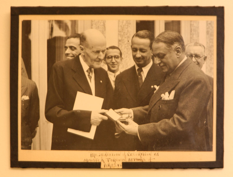 Black and white photograph showing the presentation of a decoration to Paul Harris by the Minister of Foreign Affairs of Brazil probably in 1936. In that year Harris received the Brazilian Order of the Southern Cross at the end of his South American tour, †he order itself can be seen in the display case, see the Awards section. |