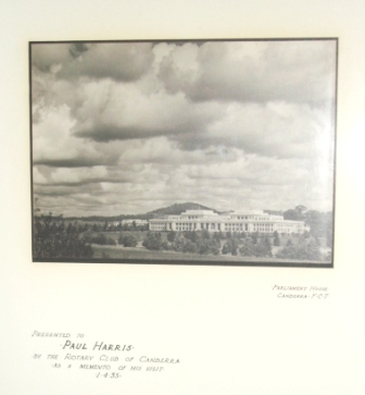 photograph of "Parliament House Canberra F .C. T ." "Presented to Paul Harris by the Rotary Club of Canberra as a memento of his visit 1-4-35" |
