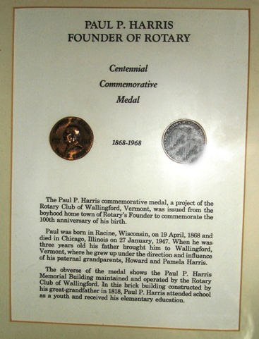 Commemorative Medal. "Centennial Commemorative Medal Paul P. Harris Founder of Rotary" .  In 1968 the Wallingford Club in Vermont, celebrated a three-fold anniversary, honoring the 100th anniversary of the birth of Paul Harris, the 150th year of the construction of the Memorial Building by his great-grandfather James Rustin, and the Club's 40th Anniversary. To observe these events, the Club issued a commemorative coin, a dollar-size coin with a bust of Paul Harris on the face and a drawing of the Memorial Building on the reverse. The bust of Paul P. Harris was done by sculptor Phil Kraezkowski, and each coin bears his signature. The Memorial Building was reproduced from a pen and ink sketch by Rotarian Gordon White of Morrisville, Pennsylvania and of Wallingford, Vermont. The coins were struck by the Robbins Company of Attleboro, Massachusetts. The medals were serial numbered and were issued in silver and bronze. One bronze and one silver coin were given to the Paul Harris Gallery.