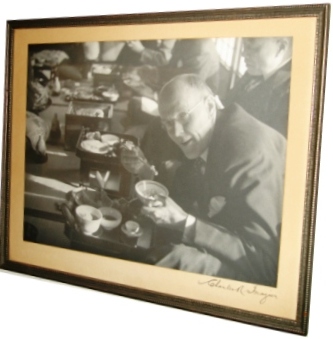 This photograph shows Paul Harris enjoying sukiyaki in Tokyo in 1936. It was probably taken at the Maple Club where, in 'Peregrinations 2' page 47, Harris writes that "We lunched that day in true Japanese style ... served by geisha girls kneeling before us as we sat on cushions on the floor and fumbled clumsily with our chopsticks." |
