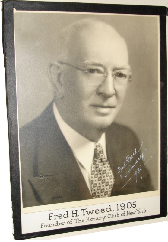 Fred H Tweed. 1905 Founder of the Rotary Club of New York. Signed "Dad Tweed himself 1936" The history of the New York Club includes tthe following; "In an effort to start the wheels rolling, Elmer de Pue consulted with Daniel Cady of New York who, as close friend of Paul Harris dispatched Fred Tweed of Chicago ( one of the early members of the Chicago Club) to talk with Cady, de Pue and Bradford Bullock at a meeting held on August 18, 1909. Six days later on August 24, 1909, the Rotary Club of New York was formed. There were 15 charter members and Bradford Bullock was elected President." |