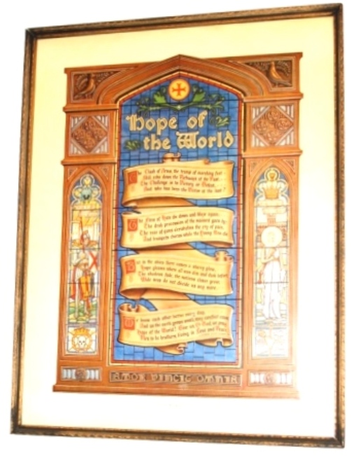 Hope of the World This colour embossed print is of a poem 'Hope of the World’ by Charles Stuart Gilmour. It is marked "Designed and printed by S.T.Leigh & Co. Ltd, Raleigh Park, Kensington, Sydney, an organization of craftsmen." A copy of this print can be found in the Powerhouse Museum in New South Wales, Australia. It dates to about 1934. The print features the text of a poem "Hope of the World" by Charles Stuart Gilmour, 1934. The poem is printed within an illustration of a stained glass window which has a decorative border. At the top of the window are doves holding olive branches. On the left is a knight in armour with a scroll reading "War hath her shame" and underneath him a depiction of a skull. On the right is a woman in robes with a scroll "Peace hath her victories" and underneath her symbols of art, science and industry (artist's palette, mallet, book, harp, scientific equipment). At the bottom of the window is the motto "Amor vincit omnia" (Love conquers all). Printed at bottom right of poem 'CHARLES STUART GILMOUR 1934'. Printed at bottom centre of print 'DESIGNED AND PRINTED BY S.T. LEIGH & CO. LTD., RALEIGH PARK, KENSINGTON, SYDNEY, "AN ORGANISATION OF CRAFTSMEN." / WITH COMPLIMENTS'. ST Leigh and Co Ltd was a Sydney printing firm, established in 1852. The company was in its Raleigh Park, Kensington premises by at least 1927. Their 1888 letterhead, an example of which is in the Museum Archives, indicates their activities were "artists, designers & chromo lithographers, engravers and general printers, account book manufacturers" and their 1928 letterhead reads "printers, lithographers, manufacturing stationers, decorated tin & cardboard box manufacturers". In 1928 they organized a major Printing Trades Exhibit held at the Museum (then known as the Technological Museum, Sydney). The Printing Trades Exhibit was on display throughout the 1930s and our 1940 annual report indicates that ST Leigh & Co Ltd had contributed further exhibits to it that year: It is possible that Paul Harris visited the Museum and saw these printing exhibits. And perhaps these prints were given to visitors? The Museum has no evidence for this, but it seems plausible. Of course he may simply have met representatives of ST Leigh & Co Ltd during his Rotary activities in Sydney and have been given the print by them. The "With compliments" would suggest that the print was not for sale. We are grateful to Helen Yoxall, the Archives Manager of the Powerhouse Museum, for the above description. |