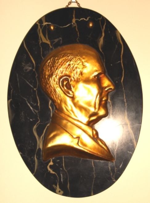 A plaque made of marble and metal depicting Paul Harris in profile. It is labelled 'Engleman 1931. |