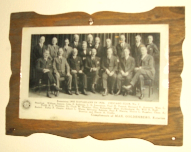 This poor black and white photograph is a reduced version of the other one showing Chicago Number One's 'Old Guard' It is mounted on a wooden plaque and on the back is an advertisement for the Goldenberg Furniture Co. Inc. It is labeled the 'Remaining 1905 Rotarians in 1926 Chicago Club No. 1. Compliments of Max Goldenberg, Rotarian.' Goldenberg is second from the right in the back row. |