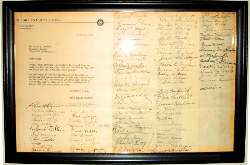 This 3 page letter dated 19 April 1933 to Mr. Paul P Harris from The Staff Society, R.I. was signed by 96 members of staff. It reads: Dear Paul Today your birthday, we believe is a good time to tell you that we are glad that you are one of us, for we think you are 'a good scout'. We are happy to add, our expressions of friendship, goodwill, and congratulations to the many others which we are sure will be reaching you from many parts of the world, and to wish you a joyful birthday and a happy life for many years to come. Sincerely yours, YOUR FELLOW MEMBERS |