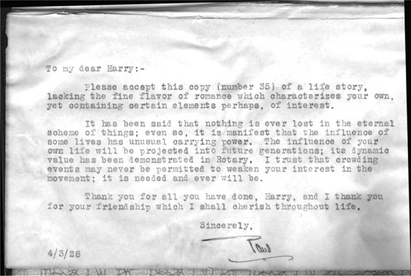 Paul Harris inscription to Harry Rogers in "The Founder of Rotary." Harry Rogers' note to his club upon donating his autographed copy of the book.
