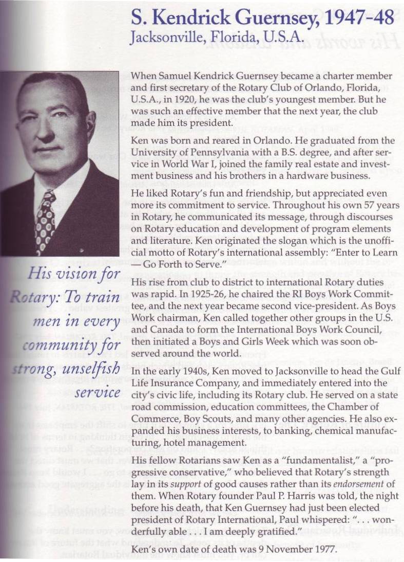 A Rotarian since 1920, Mr. Guernsey is a member of the Rotary Club of Jacksonville. He has served Rotary International as district governor, committee member and chairman, Rotary Foundation trustee, director, vice-president, and president.