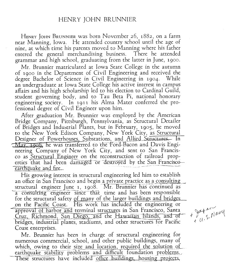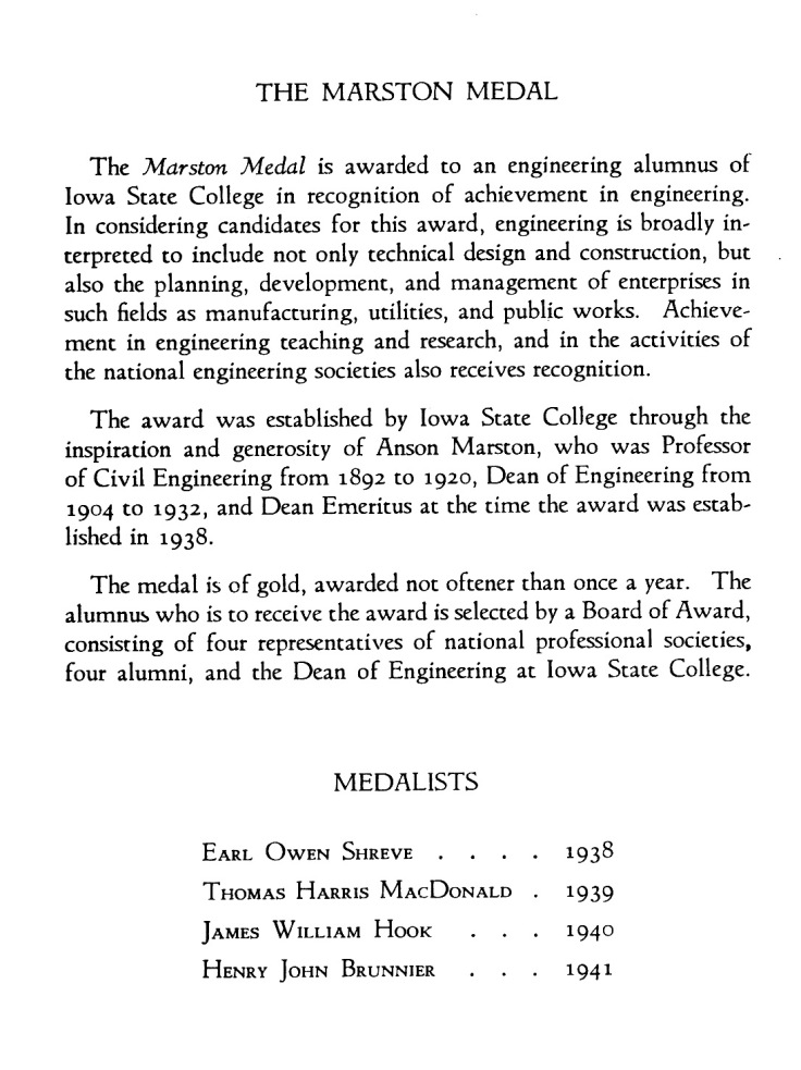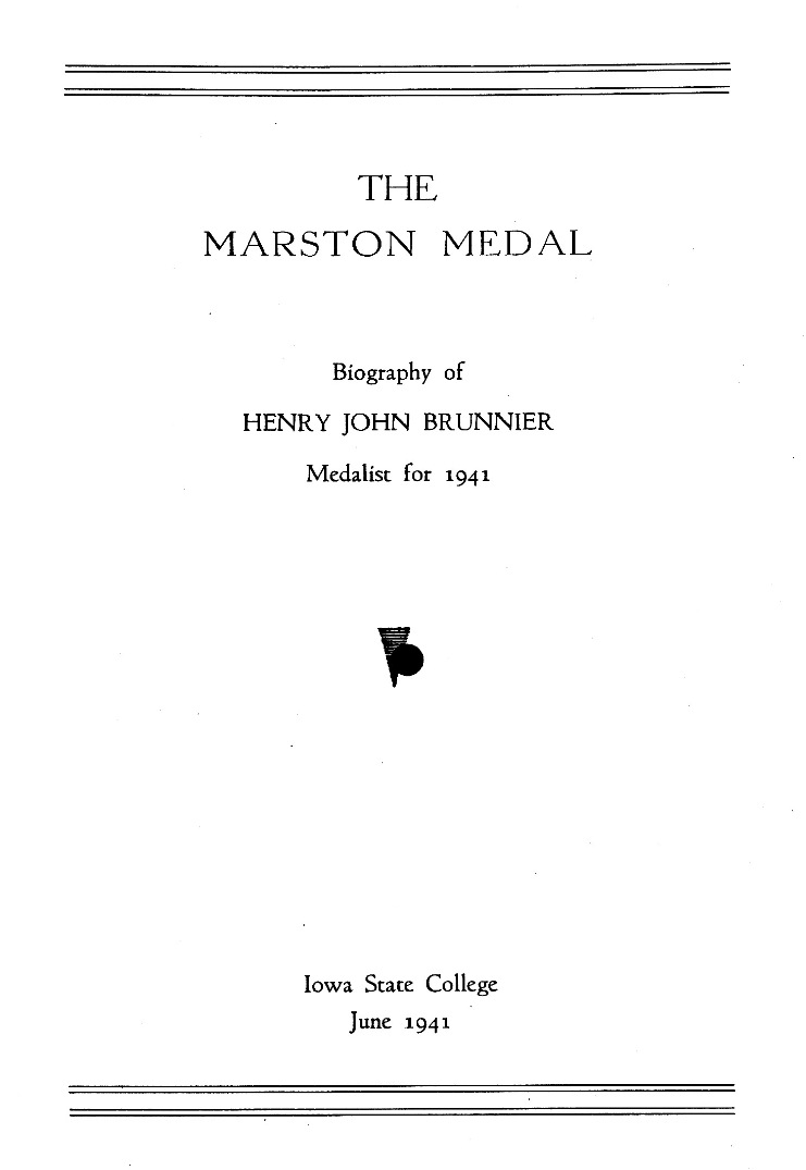 Henry John Brunnier's bio was published in June 1941 by the Iowa State College on the occasion of his reception of the Marston Medal.