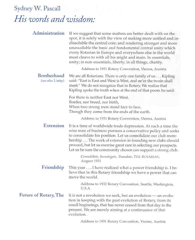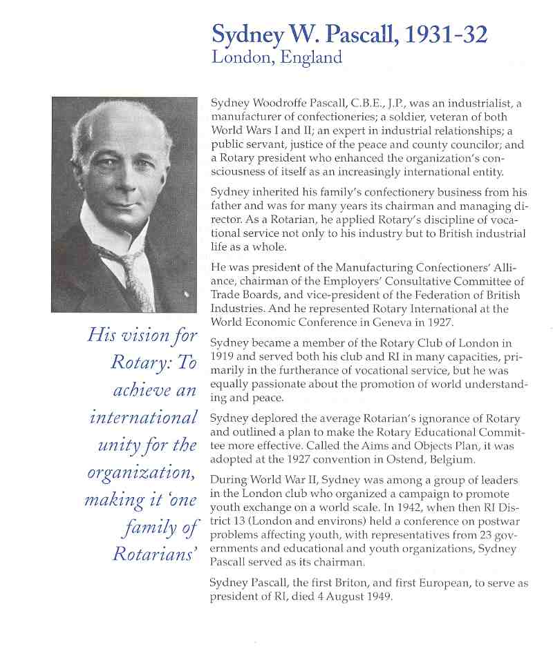 Seattle’s spacious and comfortable million-dollar civic auditorium hosted the opening of the convention. Sydney W. Pascall became the first European President of Rotary International Pascall Bio from "Paul Harris and His Successors" copyright Rotary International Bio Page 3