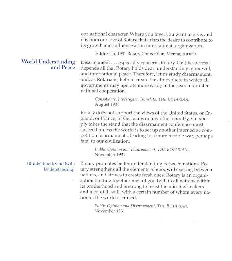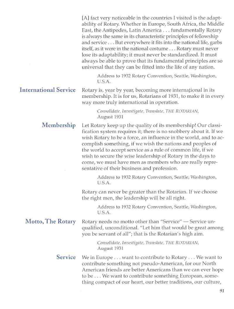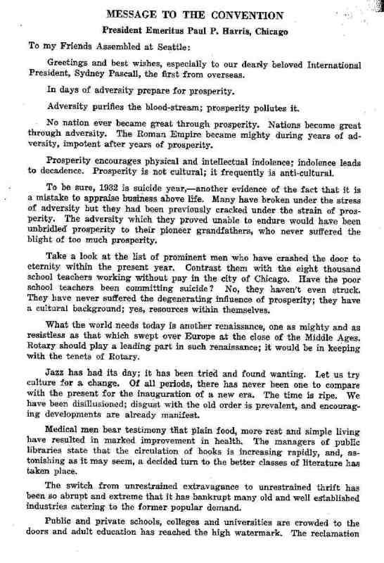 “To be sure, 1932 is suicide year, - another evidence of the fact that it is a mistake to appraise business above life. [] What the world needs today is another renaissance, one as mighty and as resistless that which swept over Europe at the close of the Middle Ages. Rotary should play a leading part in such renaissance; it would be in keeping with the tenets of Rotary.”