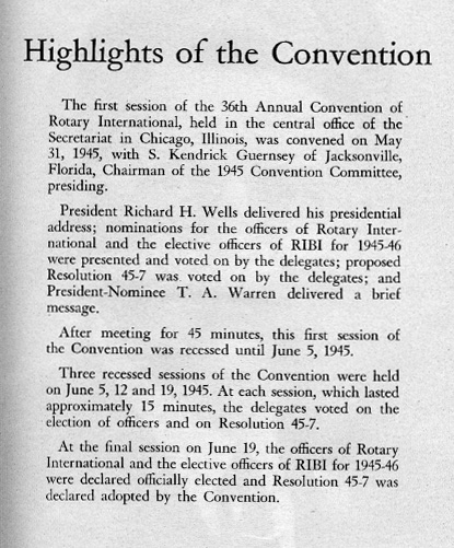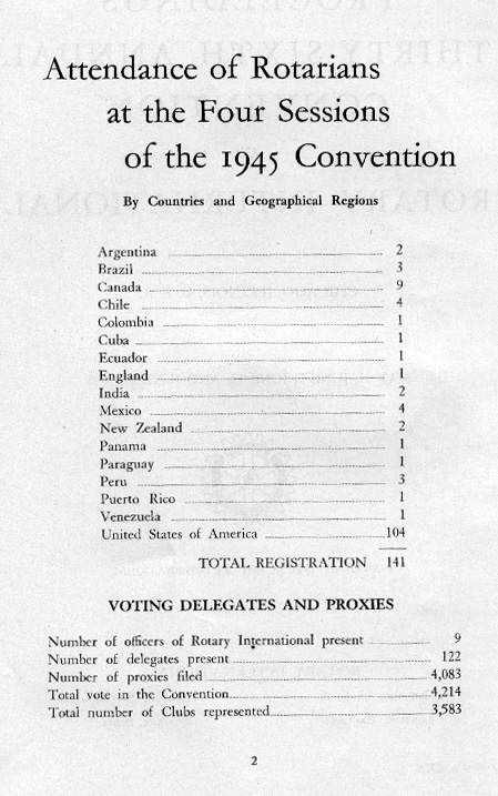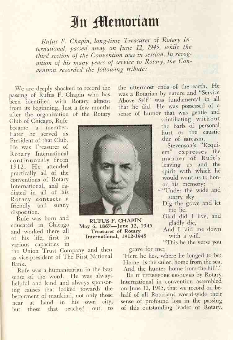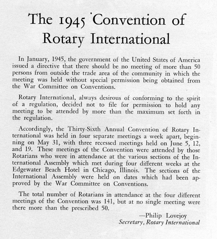Rufus Chapin, Treasurer of Rotary 1912-1945 Government orders prohibited large gatherings. see below The attendance record. Paul Harris did not provide a message for this convention. The only one for which he did not. Attendance First session